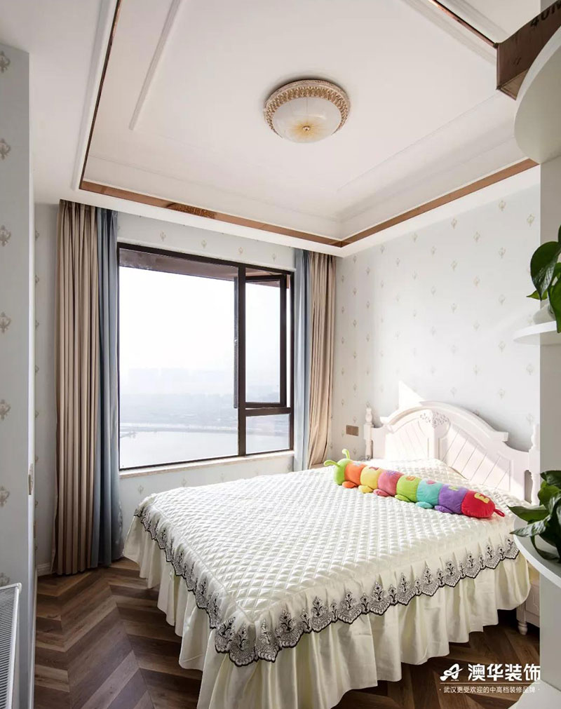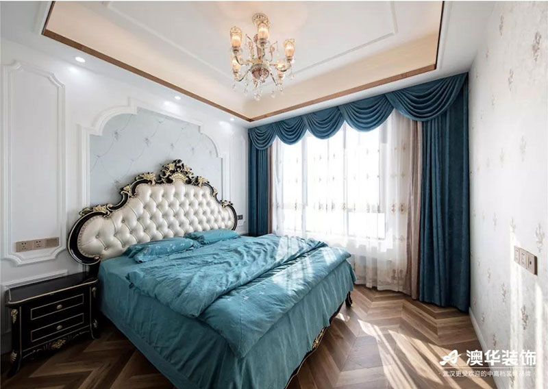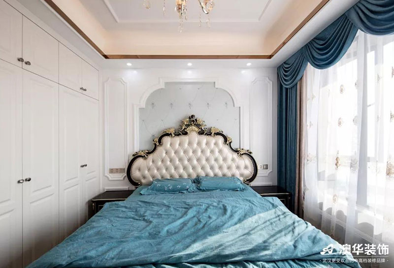 ? 與客廳的富麗堂皇有所不同,主臥更多了一些淡雅清新,讓業主能得到更舒適的休息空間。衣柜的設計充分的利用了空間,滿足業主的收納需求