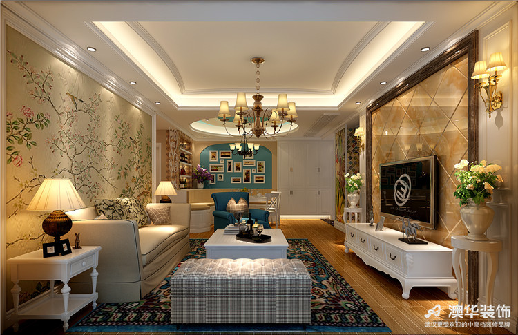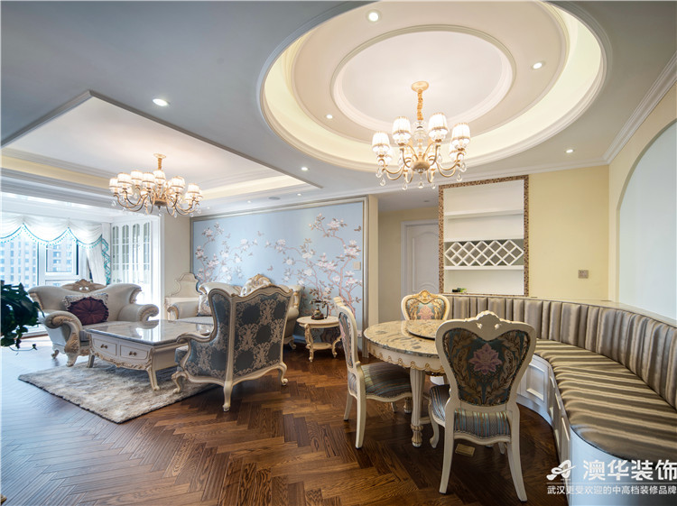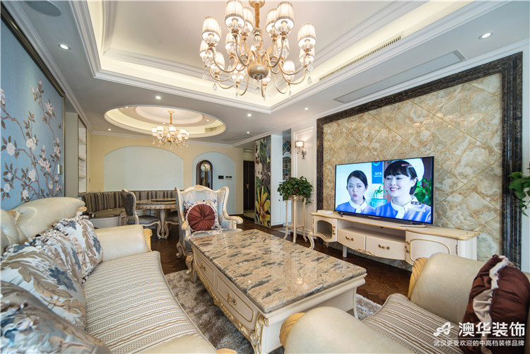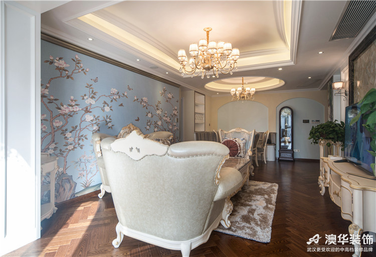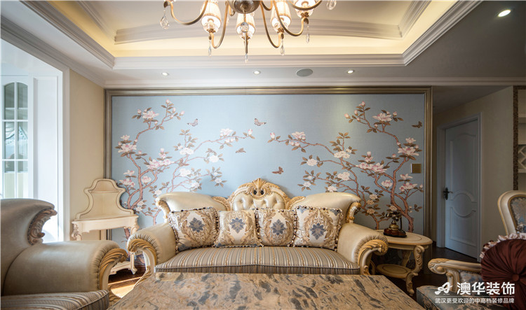 沙發(fā)背景墻為中式墻布,獨有東方韻味的春暖花開圖案與歐式輕奢家具相遇,靜美優(yōu)雅,氣質外露。