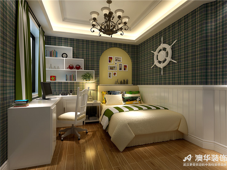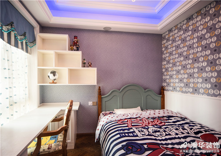 書桌設在窗臺前,保證孩子閱讀、學習時有足夠的光源。房間面積有限,收納的方式就可以靈活變通,靠窗設計墻面儲物格,美觀、實用,與床位錯開也規(guī)避了安全隱患。