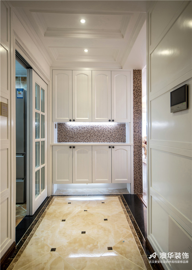 根據(jù)戶型實際結構,我們將玄關柜改設在衛(wèi)生間與廚房之間的閑置區(qū)域,合理利用空間,開拓玄關視野,避免進門堵塞的尷尬。
