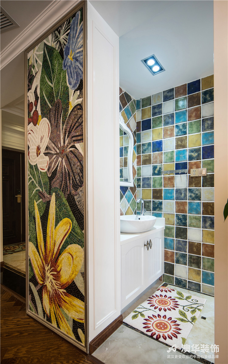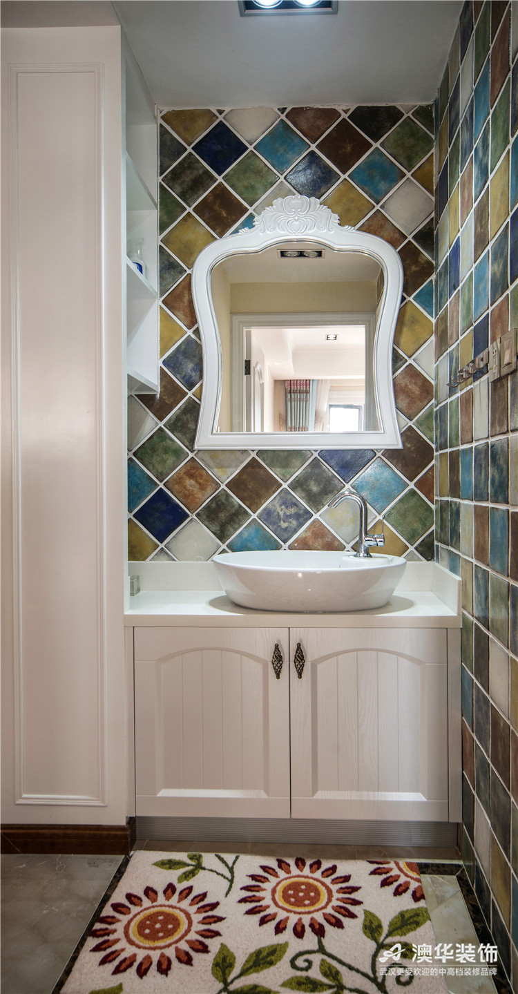 衛(wèi)生間干區(qū)內外墻選用馬賽克拼花與仿古磚作裝飾,外在生動跳躍、內里低調懷舊,使之成為極富視覺張力的焦點。