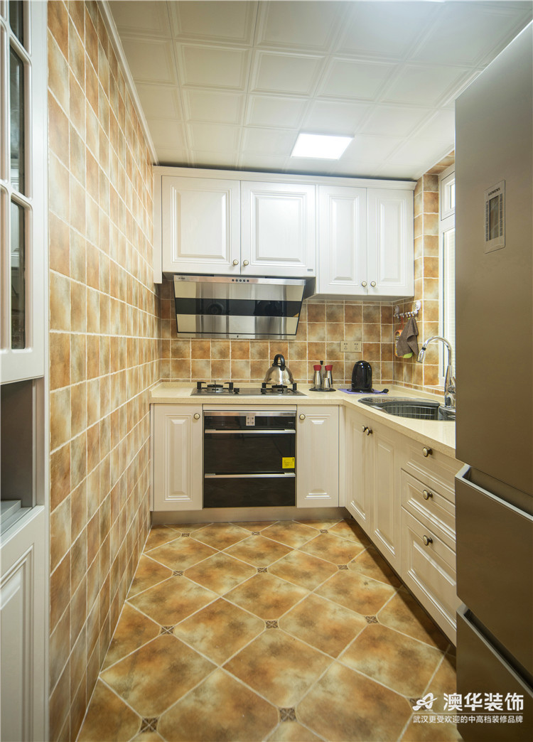 廚房的狹長格局下做L型整體櫥柜,留出充足的行走空間,方便業(yè)主與家人使用。臺面用淺色、墻地磚選深色,不過分厚重、也不至于冷清。同時,深色墻地磚也起到了耐臟、耐油煙,易清潔的作用。