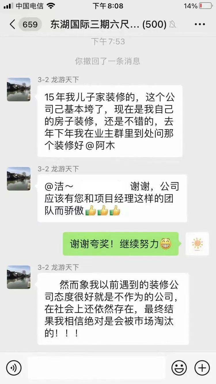 3月14日下午,復地東湖三期的業主王先生,往澳華裝飾的業主服務群轉發了一條鏈接,并熱情祝賀!原來,澳華裝飾被湖北省市場監管局評為“湖北省放心消費創建示范單位”。隨后,業主王先生又往小區的500人業主群轉發了這條消息。