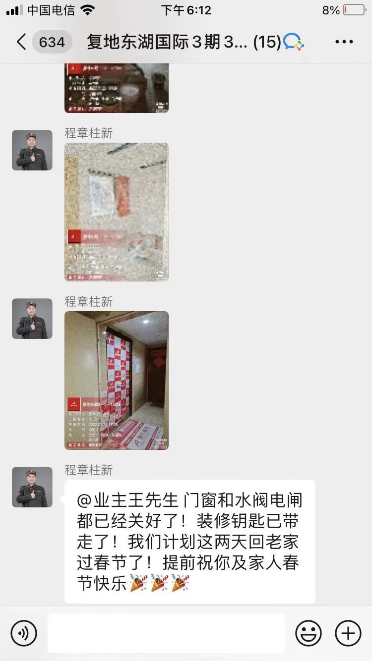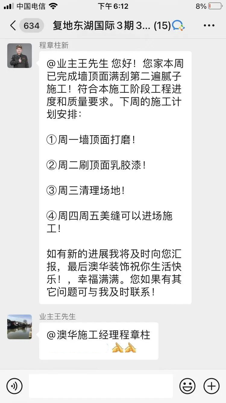 因為有過一套房子的裝修經驗,業主王先生自己便是半個裝修專家,對設計細節、施工工藝、材料品質、服務過程有非常嚴格的要求。為了讓客戶放心,設計師及交付團隊,實時在微信群眾進行進度播報,讓業主及時了解每一項施工過程及細節。