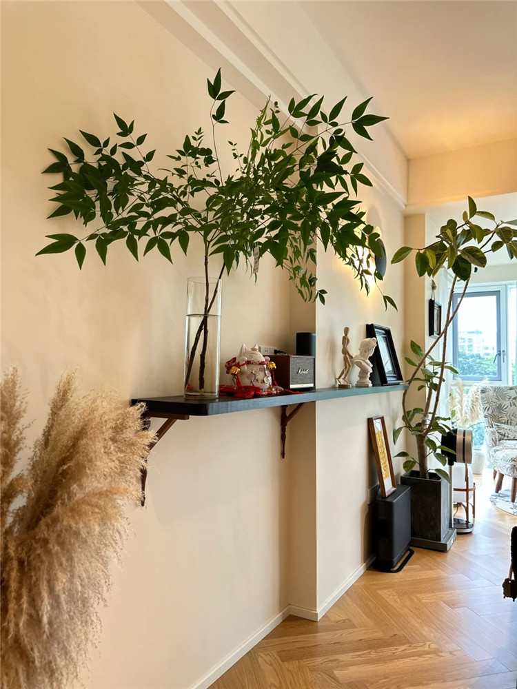比起轉角柜,擱板安裝更方便。如后續需要調整,也能輕易拆解。開放式的擱板配上一些小飾物,也可以為空間增添設計感。