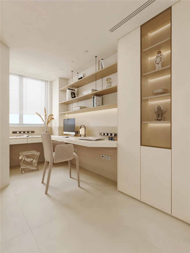 如果收納需求比較高的話,可于書桌上方做吊柜,或將懸浮書桌銜接書柜。