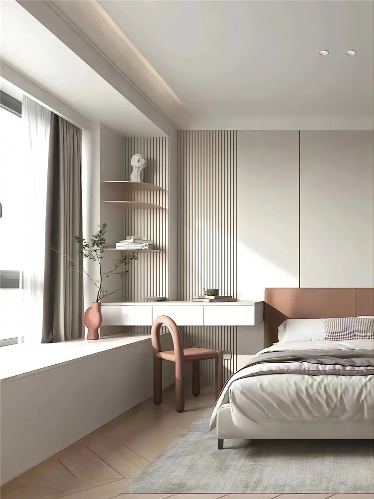 位于飄窗旁的轉角,可定制開放式收納格,增加儲物量的同時,也不壓縮空間,兼顧了顏值與實用性。