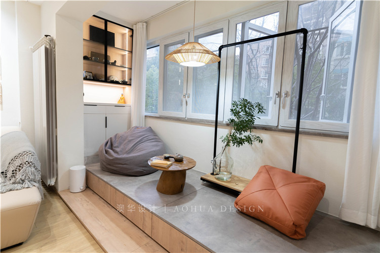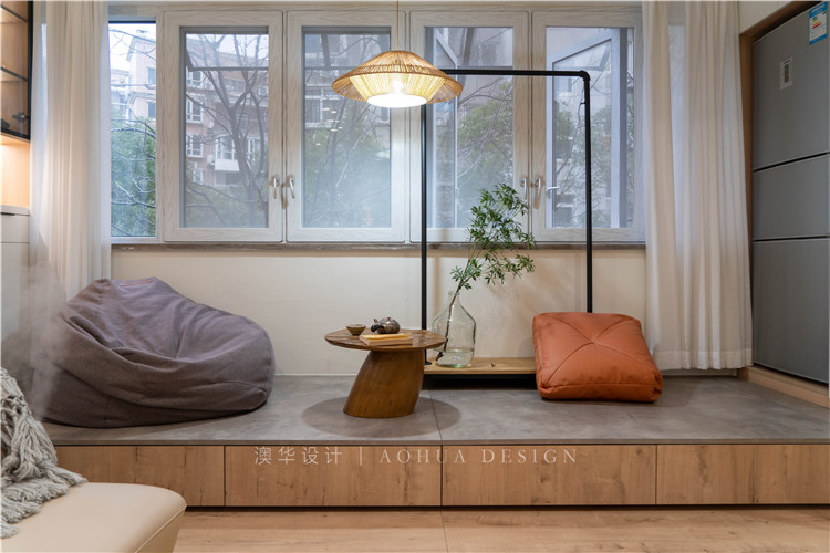 如果覺得原本的客廳空間不夠寬敞活動不開,可以選擇將陽臺利用起來,增加地臺設計,打造可席地而坐的休閑空間。