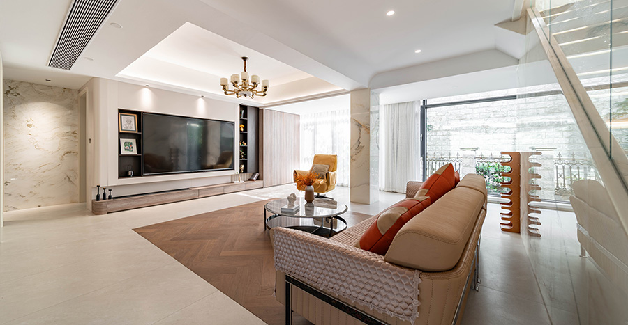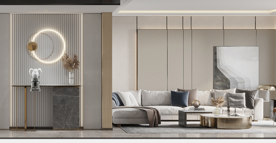 在非承重墻挖 15cm 深凹槽,搭配層板做成立體儲物區,不占地面空間,擺放書籍或者裝飾品都很美觀。