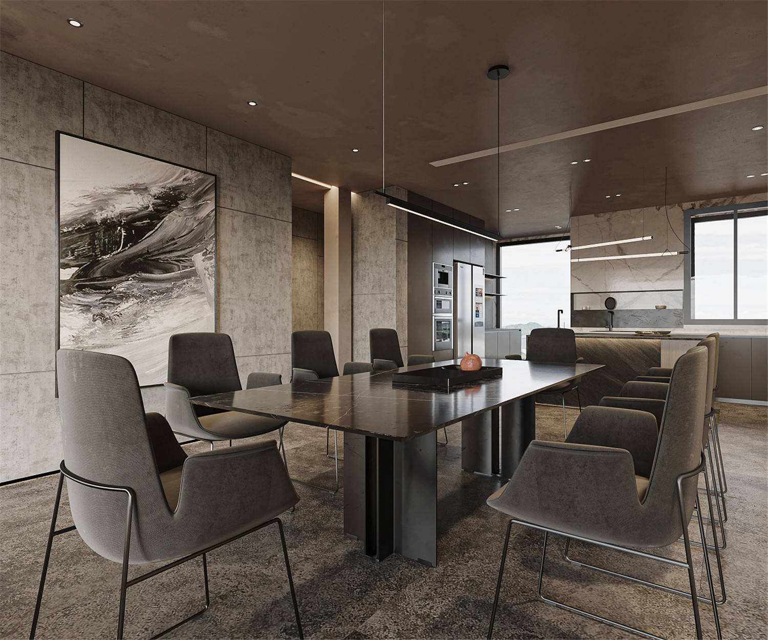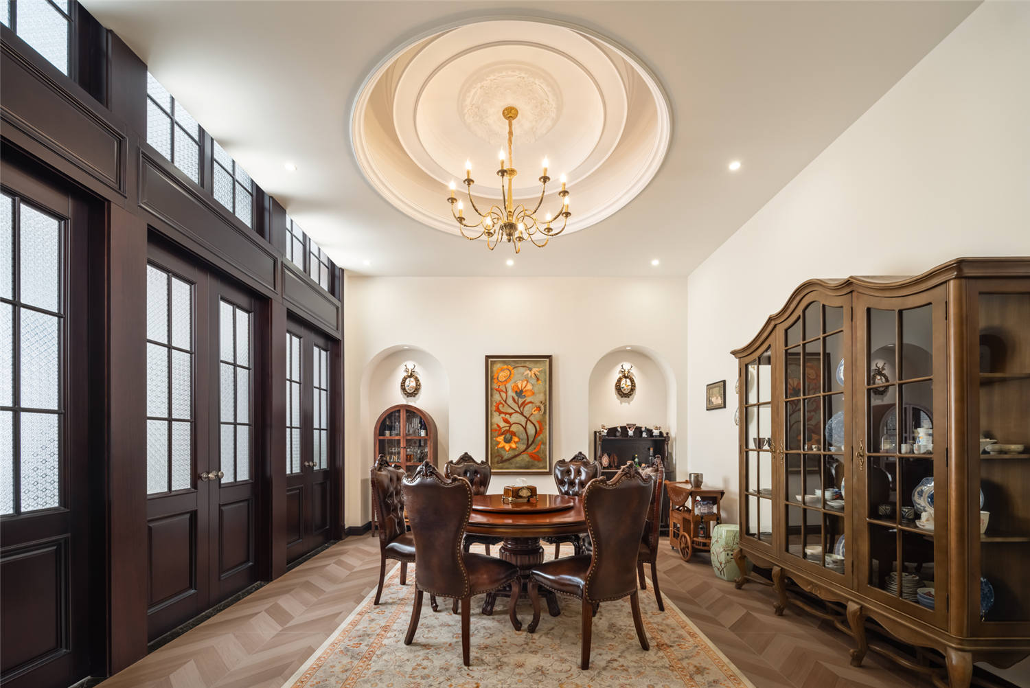 餐廳區域選用了經典的黑白配色,大面積的白色搭配上黑色餐桌椅,營造較強的視覺沖擊效果。圓形凹顯的吊頂設計搭配上低調簡約的巨型吊燈,則讓輕奢的浪漫之美更好顯露。