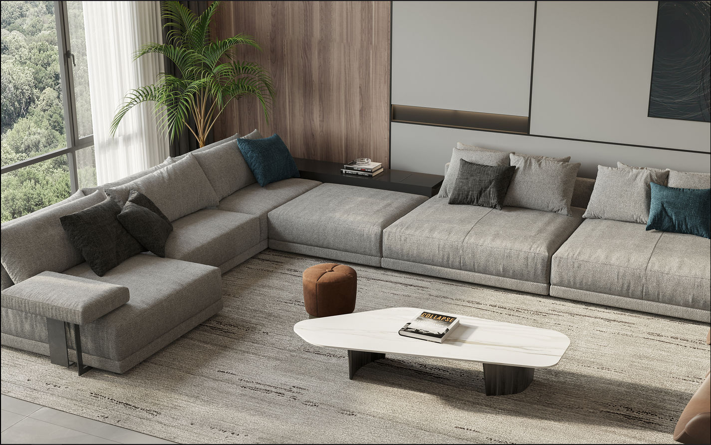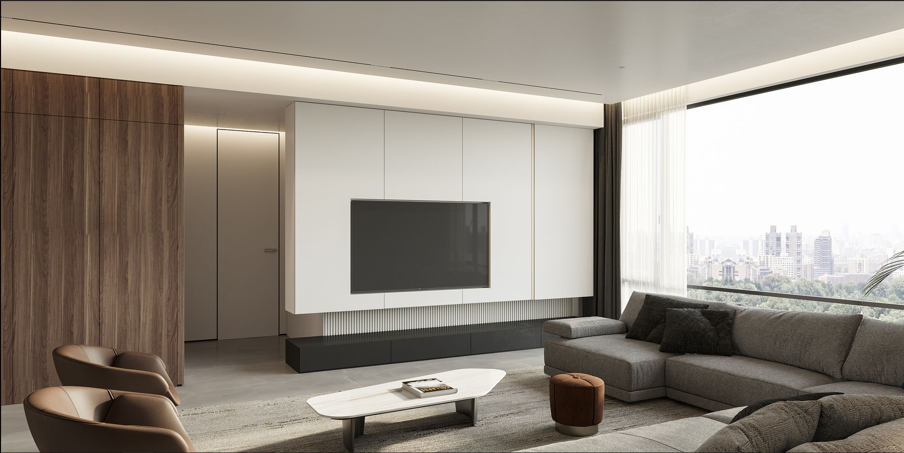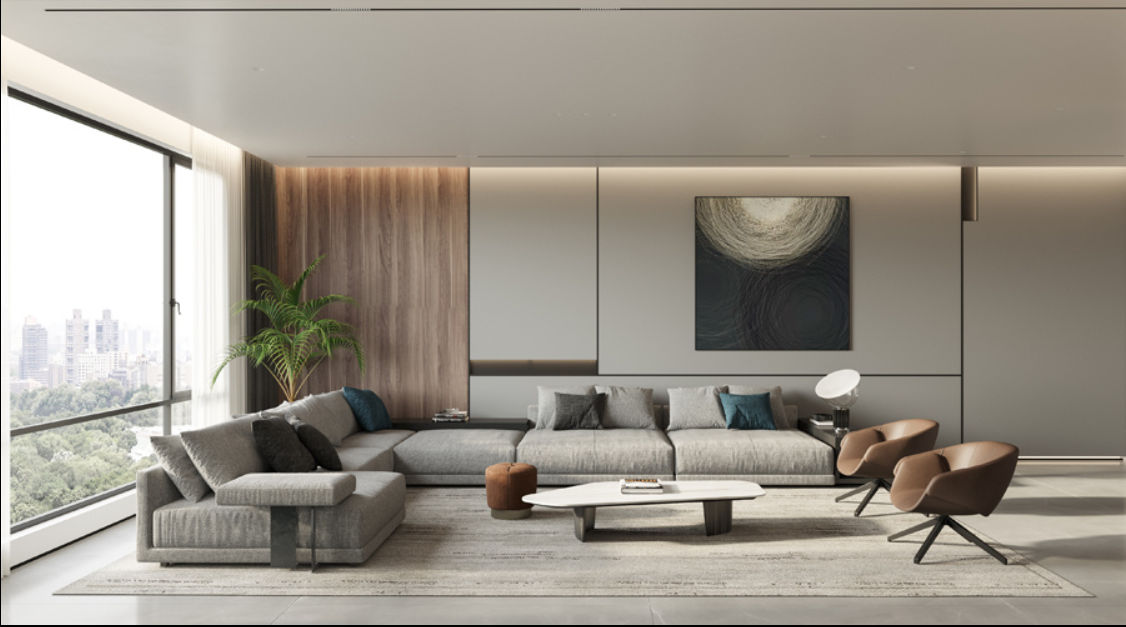 客廳區域選用了相對比較清新明麗的色彩作為主基調色,以烘托現代輕奢的自然典雅氣息。電視背景墻處大面積的大理石材質與白色木質門框相得益彰,讓簡約之美展露無疑的同時更顯和諧精致。