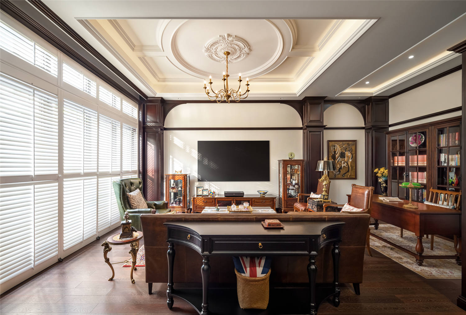 帶有木材天然紋理的深棕色書柜、桌椅搭配上簡約的綠植,一種渾厚端莊的大氣之美呼之欲出,讓整個書房空間更顯肅靜高級。