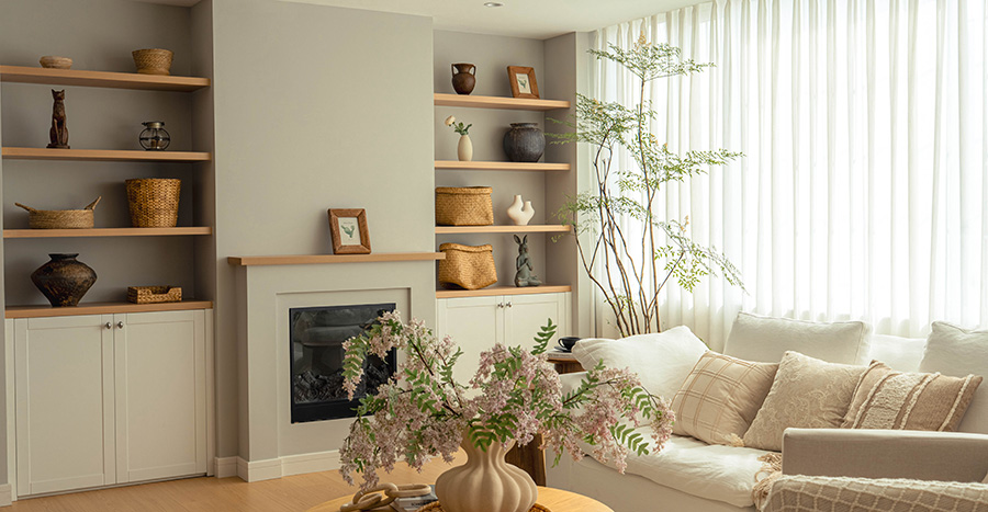 客廳區域的走廊處利用凹陷吊頂設計搭配暖黃色的圓形燈具營造一種簡約而又不失典雅的華貴美,走廊鏡頭則使用深黃色暗紋的墻紙進行裝飾,搭配以清新油畫,讓空間區域更顯明快清新。