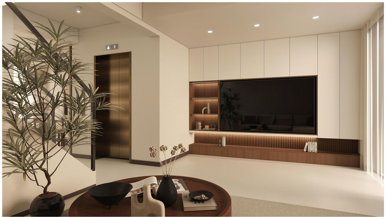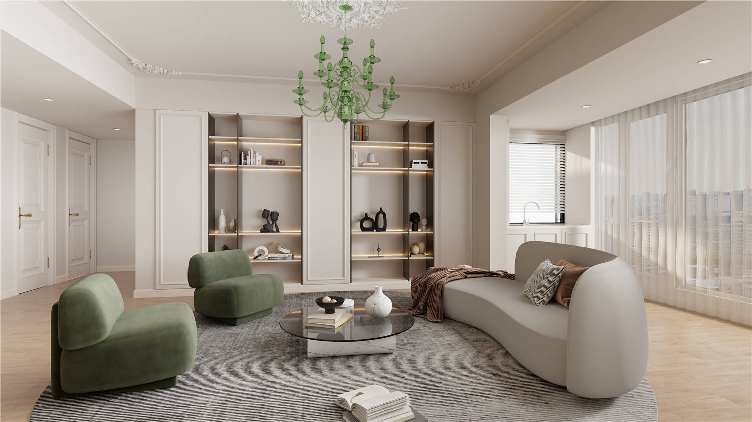 正方形的玄關寬敞大方,吊燈吊燈的橢圓形設計和地面瓷磚圖案相輔相成,樸素的灰色確保了居住的生活寧靜。