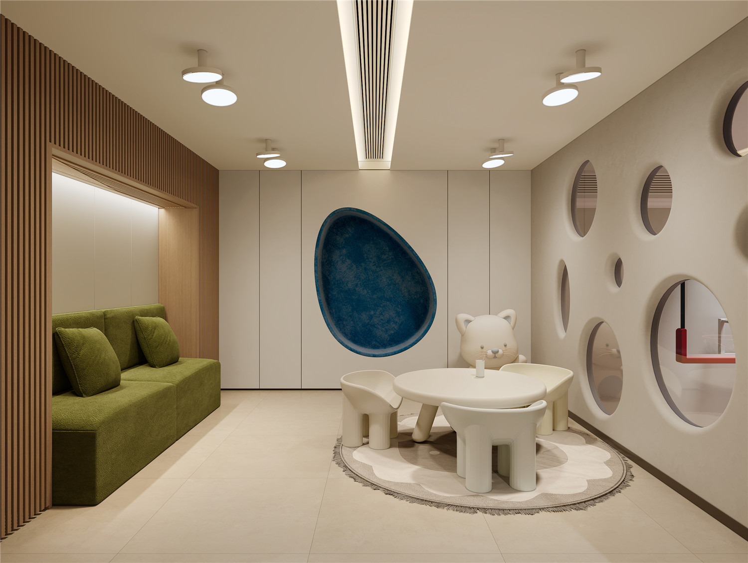 客廳以咖色系為主基調,浪漫的配色帶有女王氣質,簡約的線條中不失輕奢韻味;背景墻一面設計為書柜,一面設計為辦公空間,別有一番風味;灰色絨質沙發與橘色單椅圍合式放置,空間更具設計感,雕塑、擺件、燈具等元素,都令客廳帶有復古的氣息。