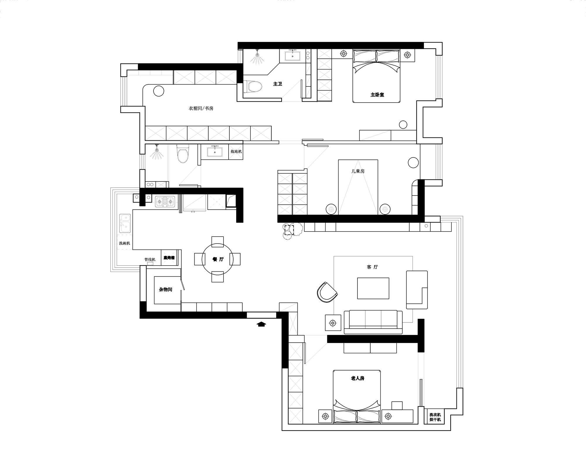 案例解析:該房為業主改善住房,男主人經常出差,比較喜歡酒店風格,女主喜歡健身,喝茶,故在客廳陽臺處設計留了健身區,吧臺區。該房主兒子和父母會偶而來居住,所以另外兩間房都以臥室設計為主,并設置了書桌功能。雖然設計整體很簡單,卻可以滿足自己喜好的同時也滿足了一家人居住的需求。