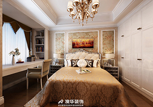 臥室使用了大量的暗紋設計,如床頭柜的暗紋筆直、床具上的暗紋雕花等等,這些暗紋設計相對沒有那么顯眼,不會破壞臥室的靜謐感,同時還能在無形之中彰顯歐式風的高貴典雅氣息。