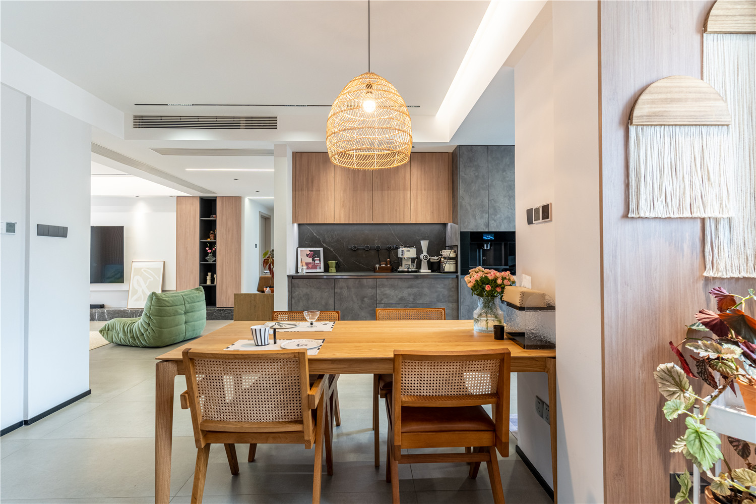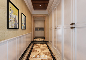 這所彭彬東湖壹號的四居室房屋面積為196㎡,空間不算小,且空間原始結構的缺陷相對比較少,因此設計師沒有對格局進行過多改動,在保留原有戶型結構的基礎上進行了合理的裝飾設計。由于過道處空間相對比較狹小且距離較長,設計師在對該區域進行設計的時候就利用了色彩的搭配以及裝飾元素的點綴,來提升該空間的美觀度與大氣感。