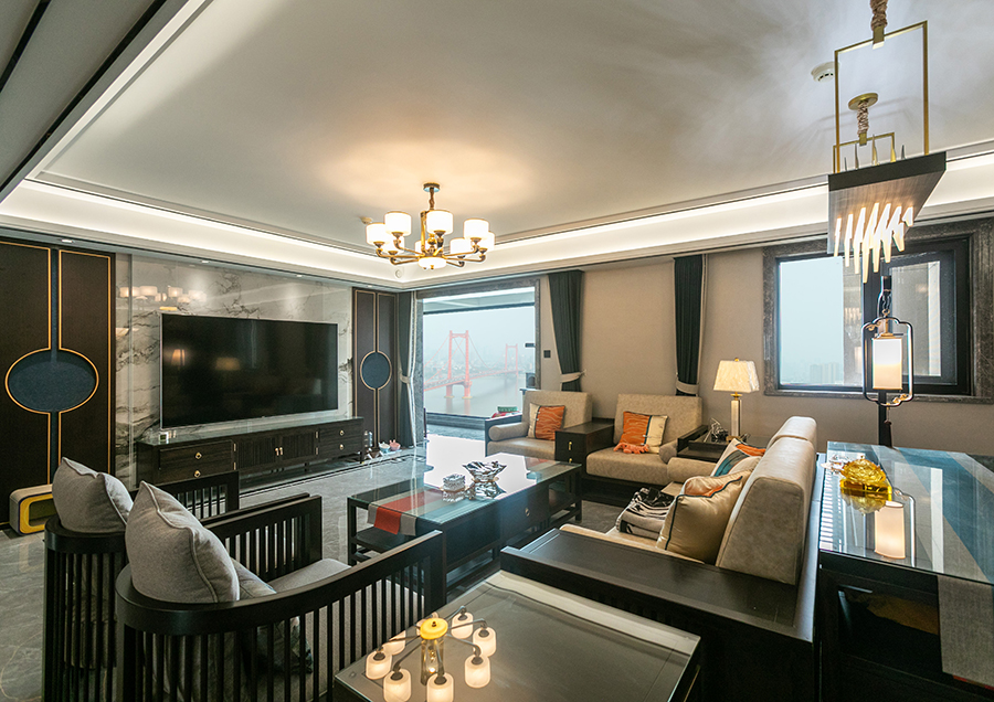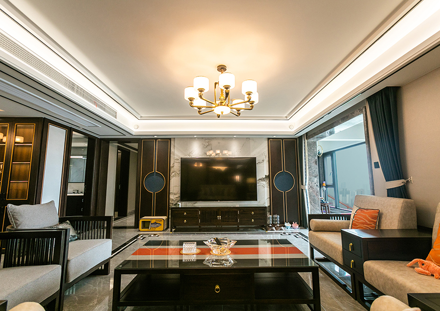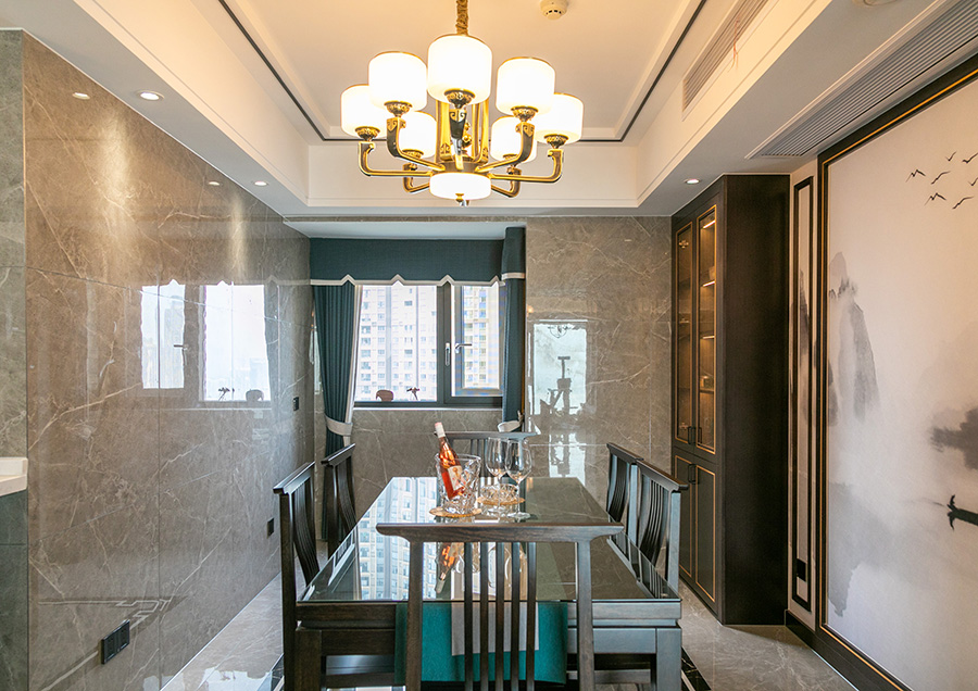 案例簡介:本案例的業主作為一個教師,對于傳統的中國文化有著濃厚的興趣,因此在與設計師交流的時候強烈的表達了自己對中式元素的喜愛。因此在本案例設計過程中,設計師為業主選用了經典的新中式風,同時借助各類質感元素的雜糅使用,演繹了一個復古而又不失摩登時尚氛圍的輕奢雅苑。簡約的線條、傳統的中式復古元素,讓家居空間呈現出豐富的層次與藝術的格調。