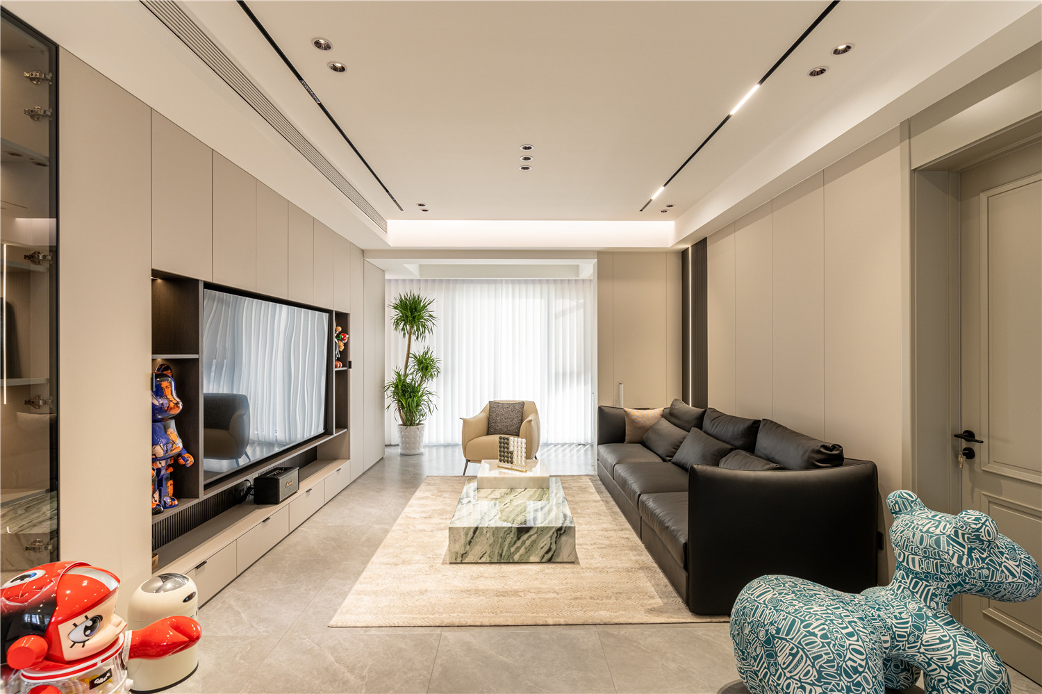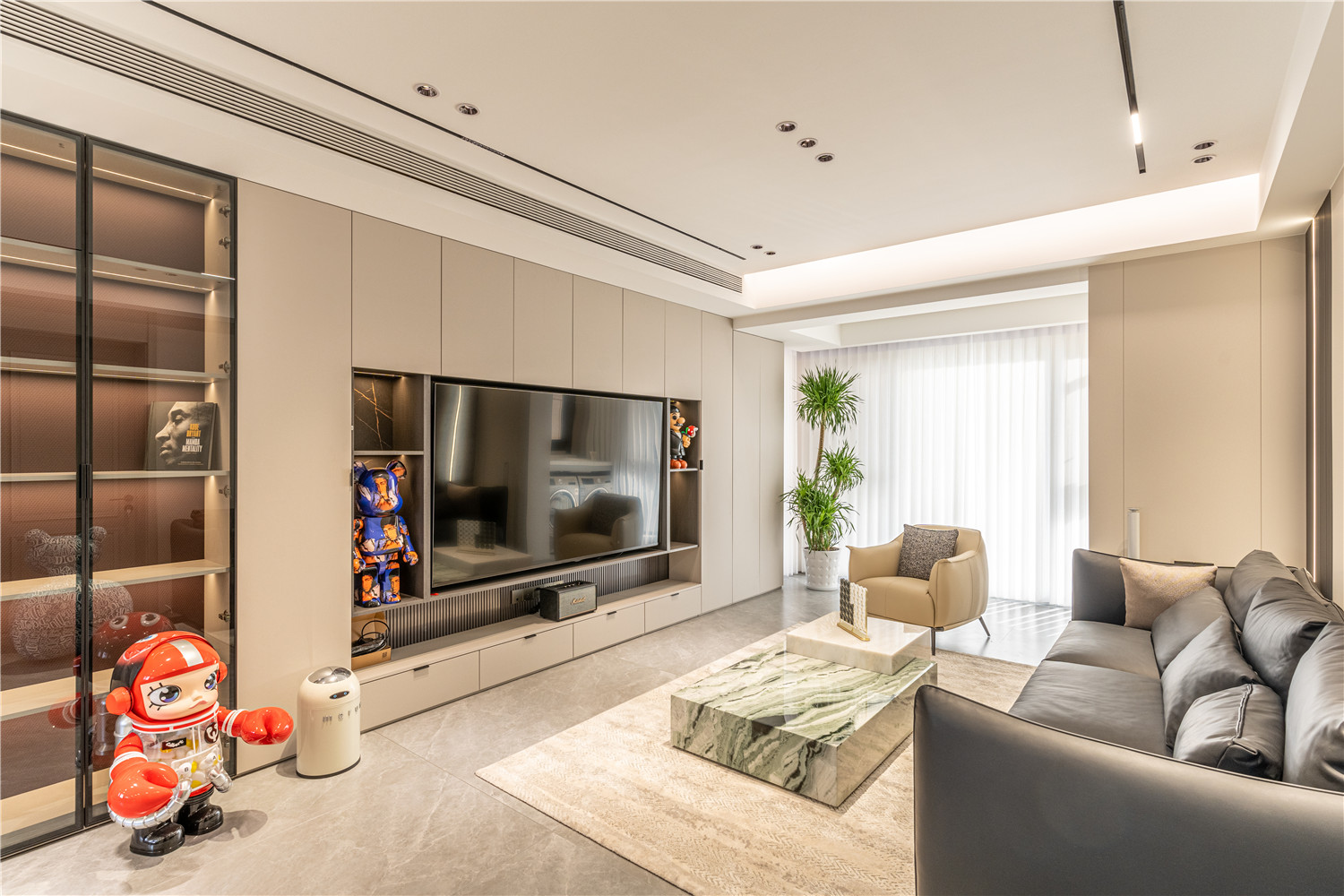 大面積的大理石瓷磚奠定了清冷通透的空間氛圍,搭配以質感溫潤的木材,有效提升了空間的視覺平衡感。