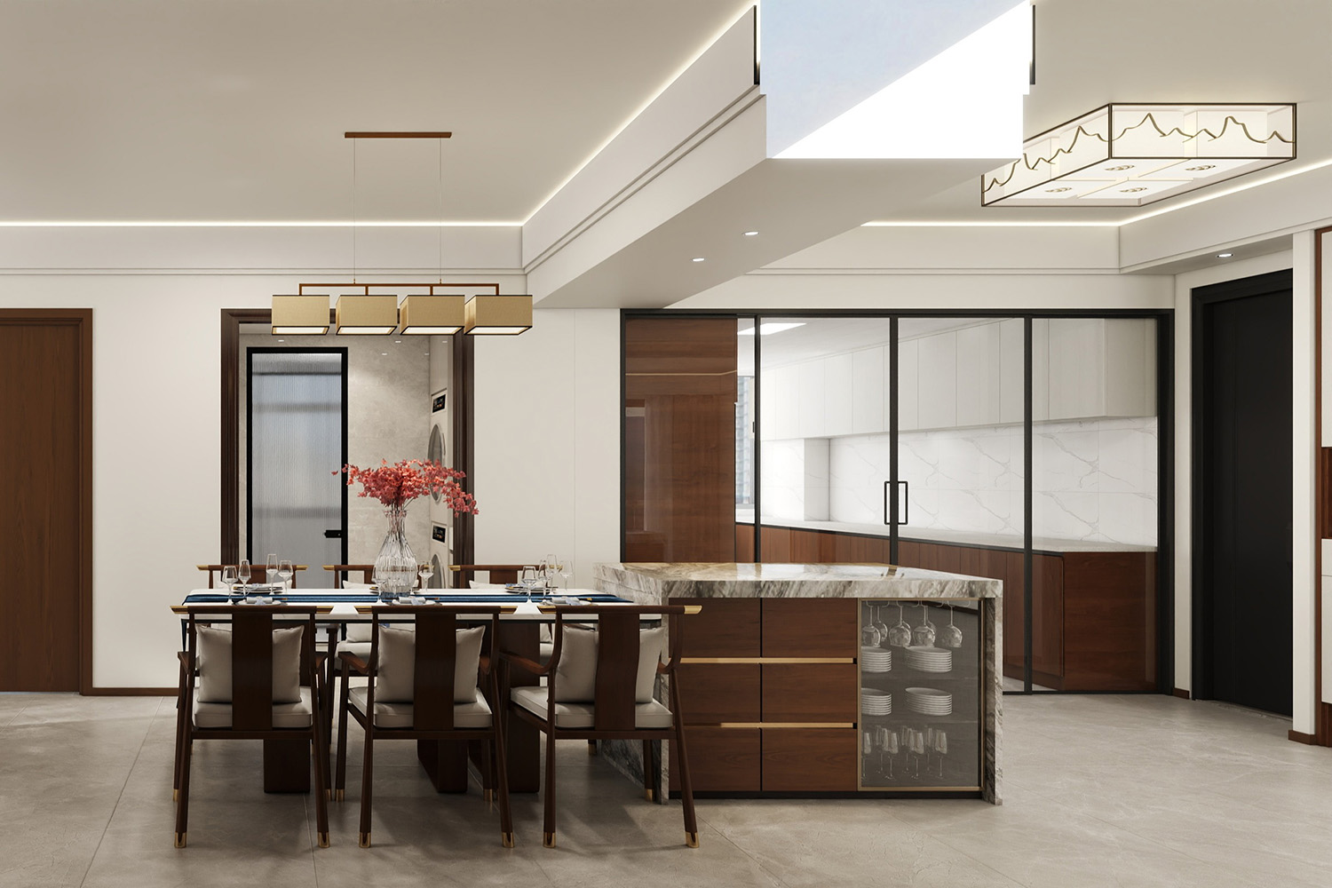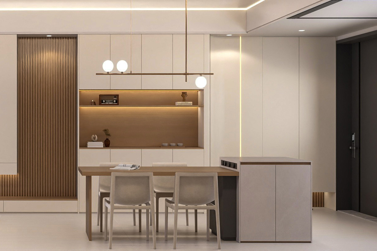 大理石臺面賦予空間沉穩大氣感,半開放式設計讓廚房空間更顯寬敞大氣。