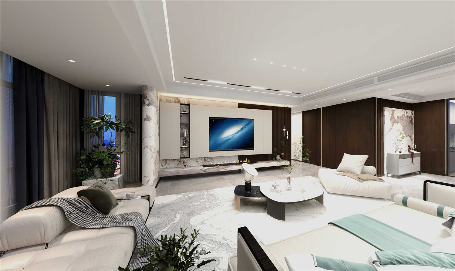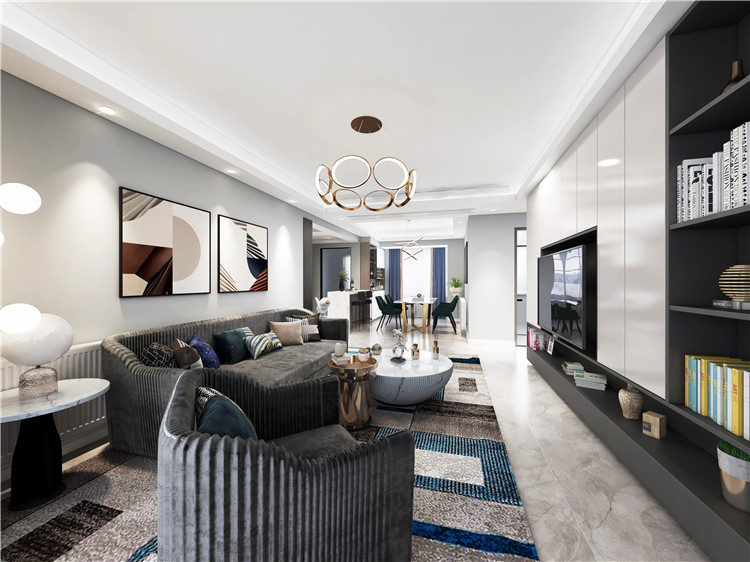 客廳以低飽和度的家具裝飾為主,設計師選擇了比較精致的沙發和地毯,同時在搭配上流利的裝飾畫,突出了客廳的簡約與精致;電視墻的設計以功能性為主,黑白二色的相互融入,令室內變得更加高級。