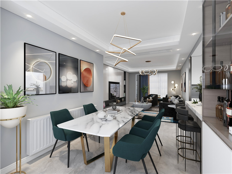 餐廳的細節可以感受到現代簡約風格自帶的溫馨之感,大理石餐桌搭配墨綠色餐椅,讓空間變得更加時尚,裝飾畫、燈具和綠植的點綴,賦予了空間活力與生機。