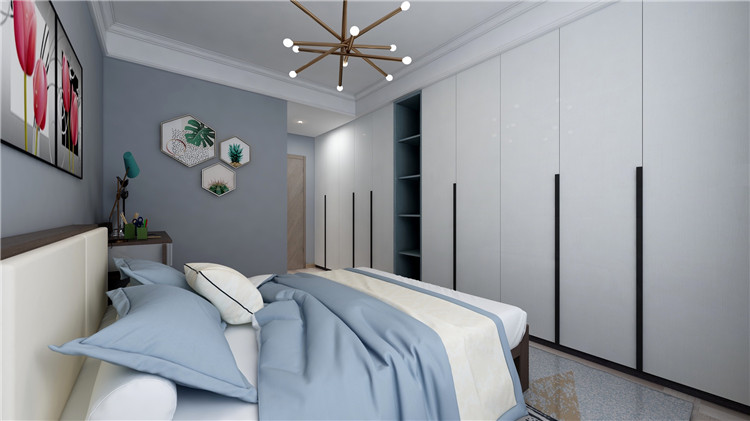 臥室中使用嵌入式衣柜,空間變得更加通透自然,不僅滿足了收納需求,也提升了臥室的空間感,冷色背景墻與暖色床品的相互結合,令空間變得更加富有藝術性。
