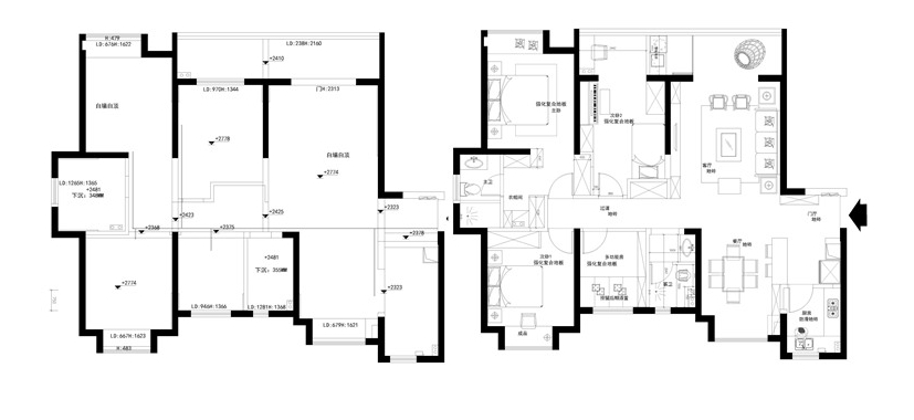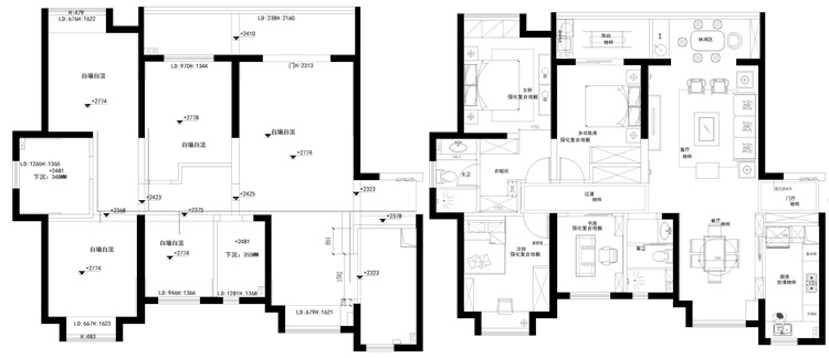 戶型格局總體方正,原始戶型中,客餐空間畸角處多,空間利用不合理,多處零碎空間沒有得到規劃,設計師將廚餐開放式設計,并通過過道劃分出客廳與餐廳,功能區變得更加敞亮了;臥室雖然集中分布,但舒適度不高,設計師在主臥中設計了衛生間,公衛干濕分離,提升了居住的舒適度。