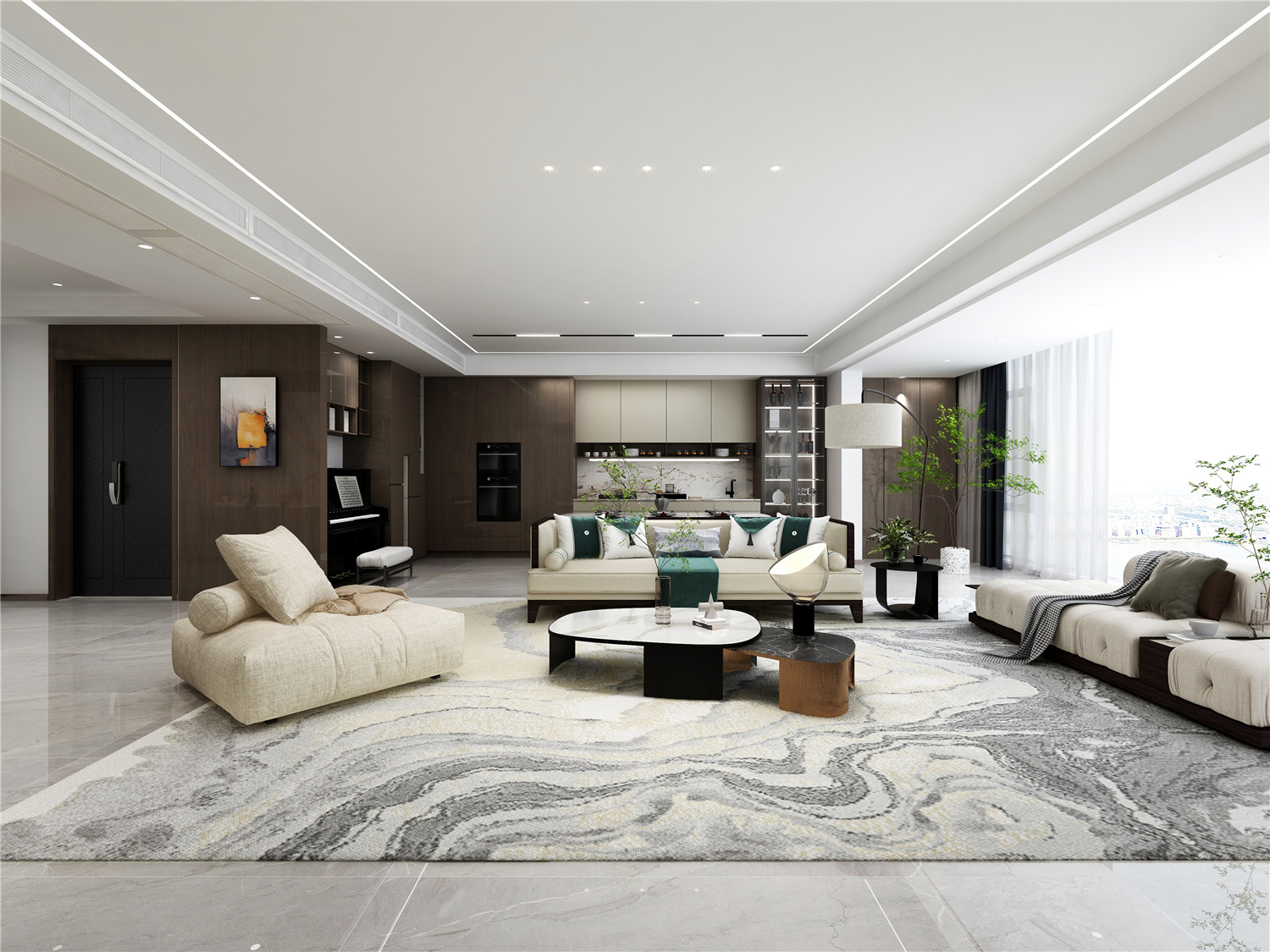 客廳空間利用溫潤的家具搭配水墨畫背景,展現出東方的禪意之美,傳達出舒適素雅的格調;沙發、茶幾、燈具、地毯等家具裝飾,既彰顯了中式的儒雅,又滿足現代生活的生活需求。