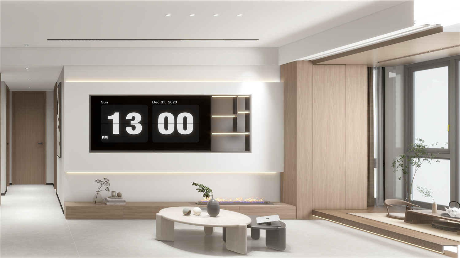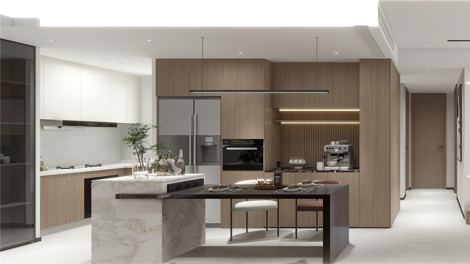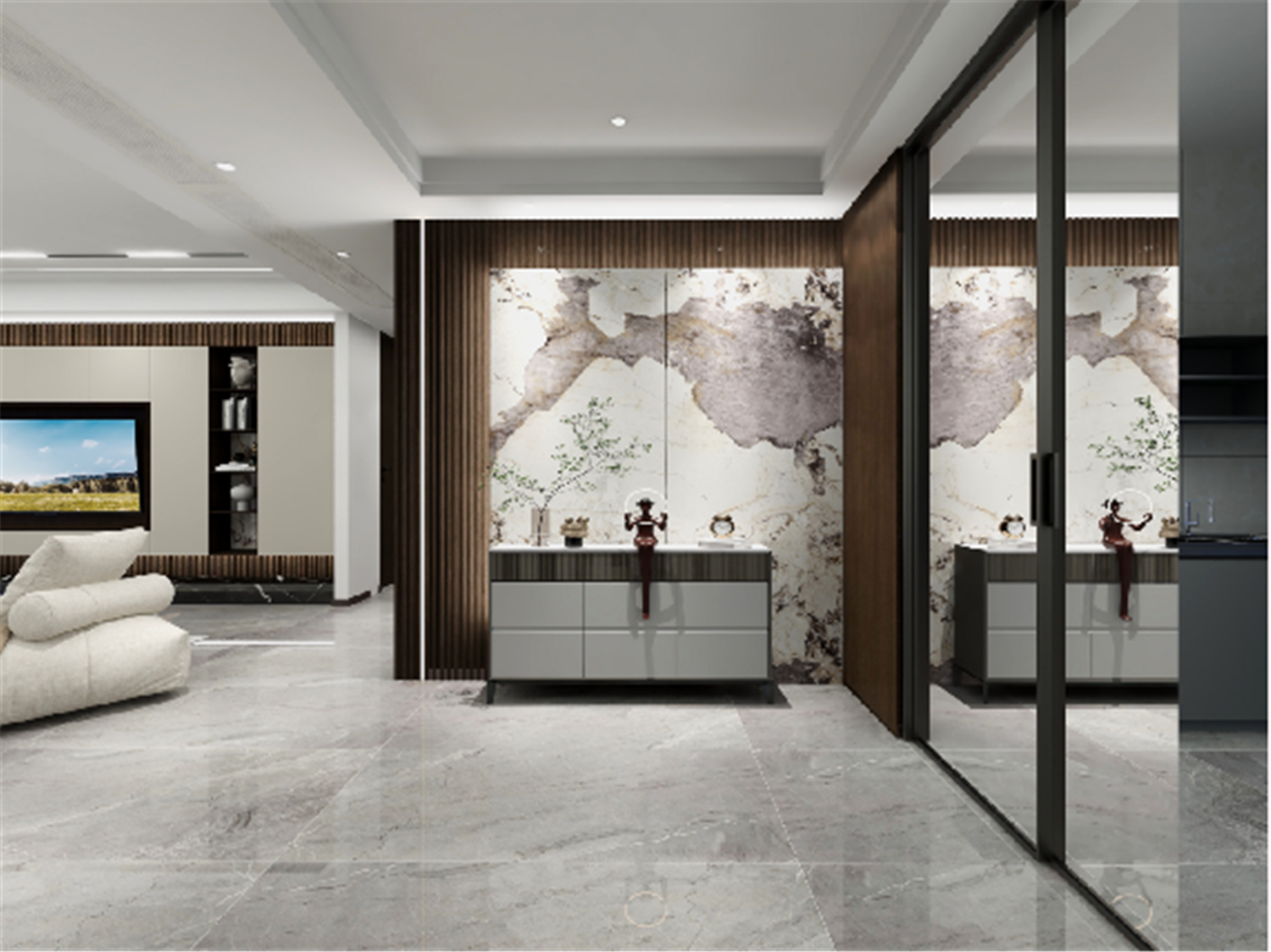 走廊的設計主要在頂面和地面,吊頂與地磚都采用矩形線條勾勒,提升了過道的空間感,在燈光的渲染下,為整個空間帶來了中式格調。