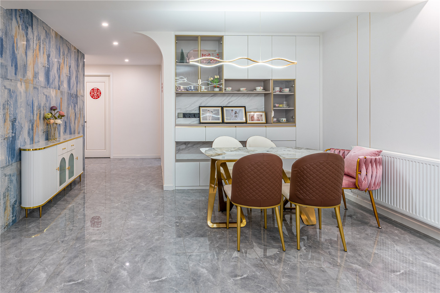 在白色的餐廳空間中搭配上暖色餐椅,用餐空間立刻有了一絲絲暖意;餐邊柜設計富有層次感,白色柜面選擇了燈帶進行點綴,藝術燈具和掛畫改善了內部呆板的環境,呈現出精致簡約感。