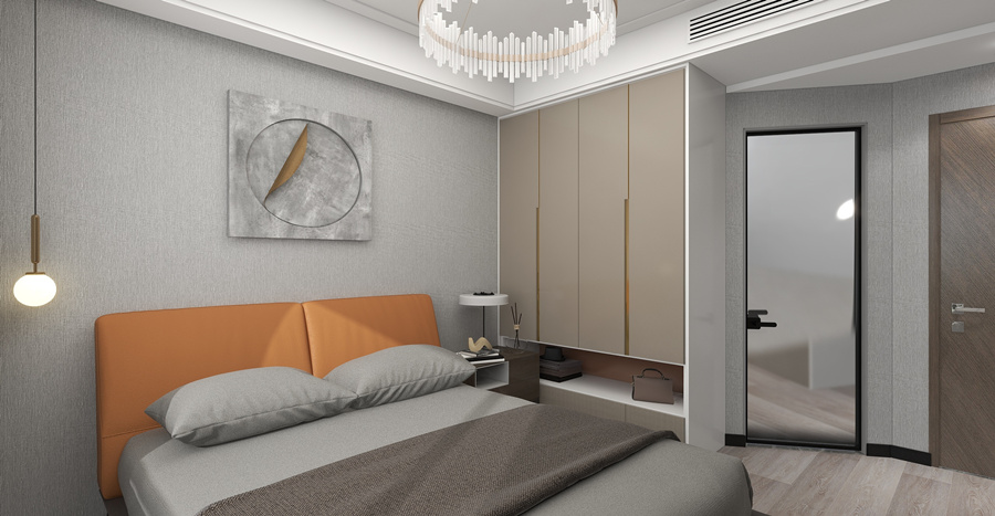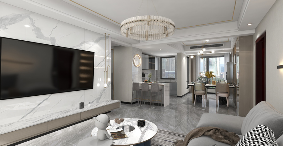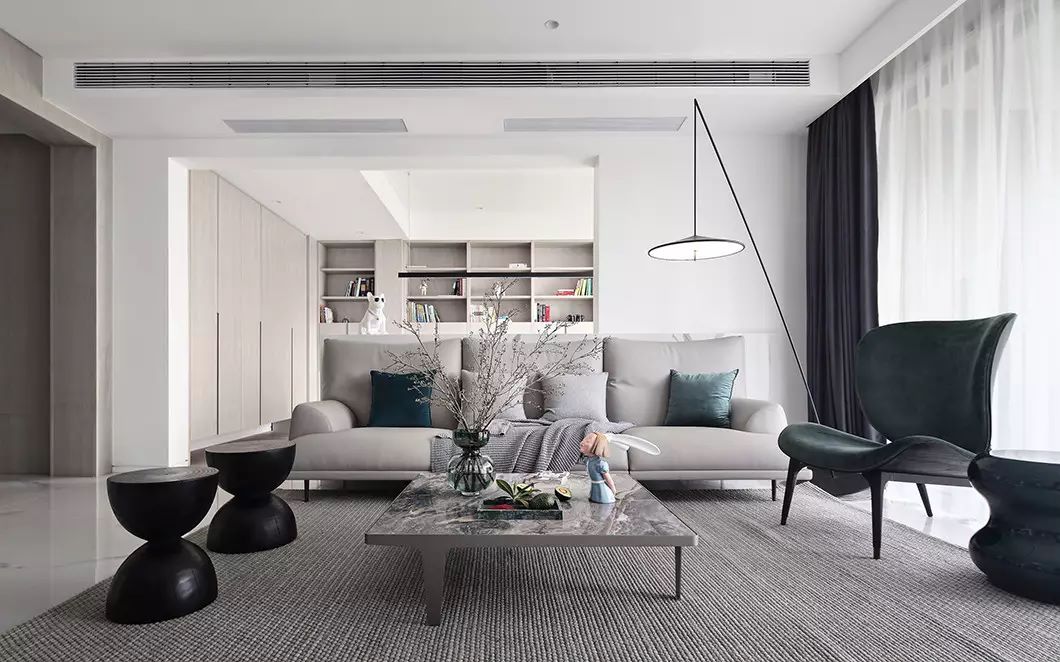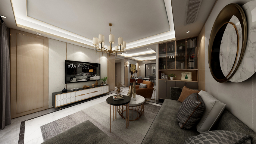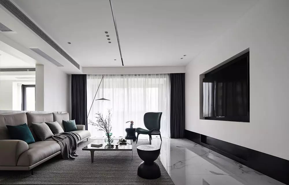 這套位于綠地金融國際城的四居室房屋面積雖然在220㎡左右,但是由于戶型并不方正平整,且存在著零碎角落,因此存在著較大的設計難題。為了讓所有的空間都得到合理的充分利用,化解戶型缺陷,設計師對空間進行了再規劃,將入戶處左邊的狹長條區域打造成廚房,利用戶型的轉折減少油煙進入生活空間的概率。同時將該區域進行一定的再切割,規劃出一塊置物空間,有效提升了家居空間的利用率。