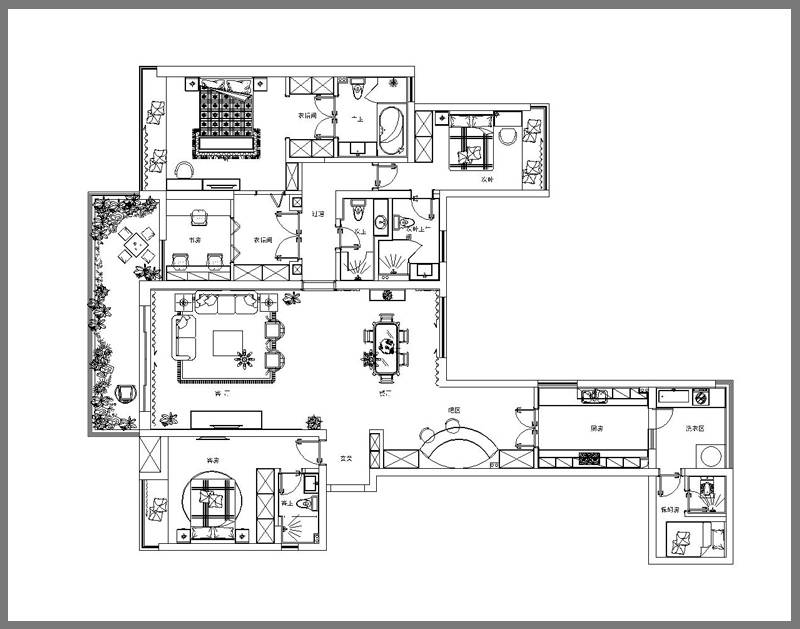 這套位于華僑城的300平方米五居室戶型整體方正歸整,客餐一體,橫廳大,公共活動空間寬敞,主次臥帶有衛生間,生活舒適度高,戶型缺點在于,右下角空間呈手槍型,餐廳到廚房的距離有些狹長,拐角處容易出現采光死角,在這個部分增置了一些軟裝設計,緩解了空間帶來的壓抑之感。