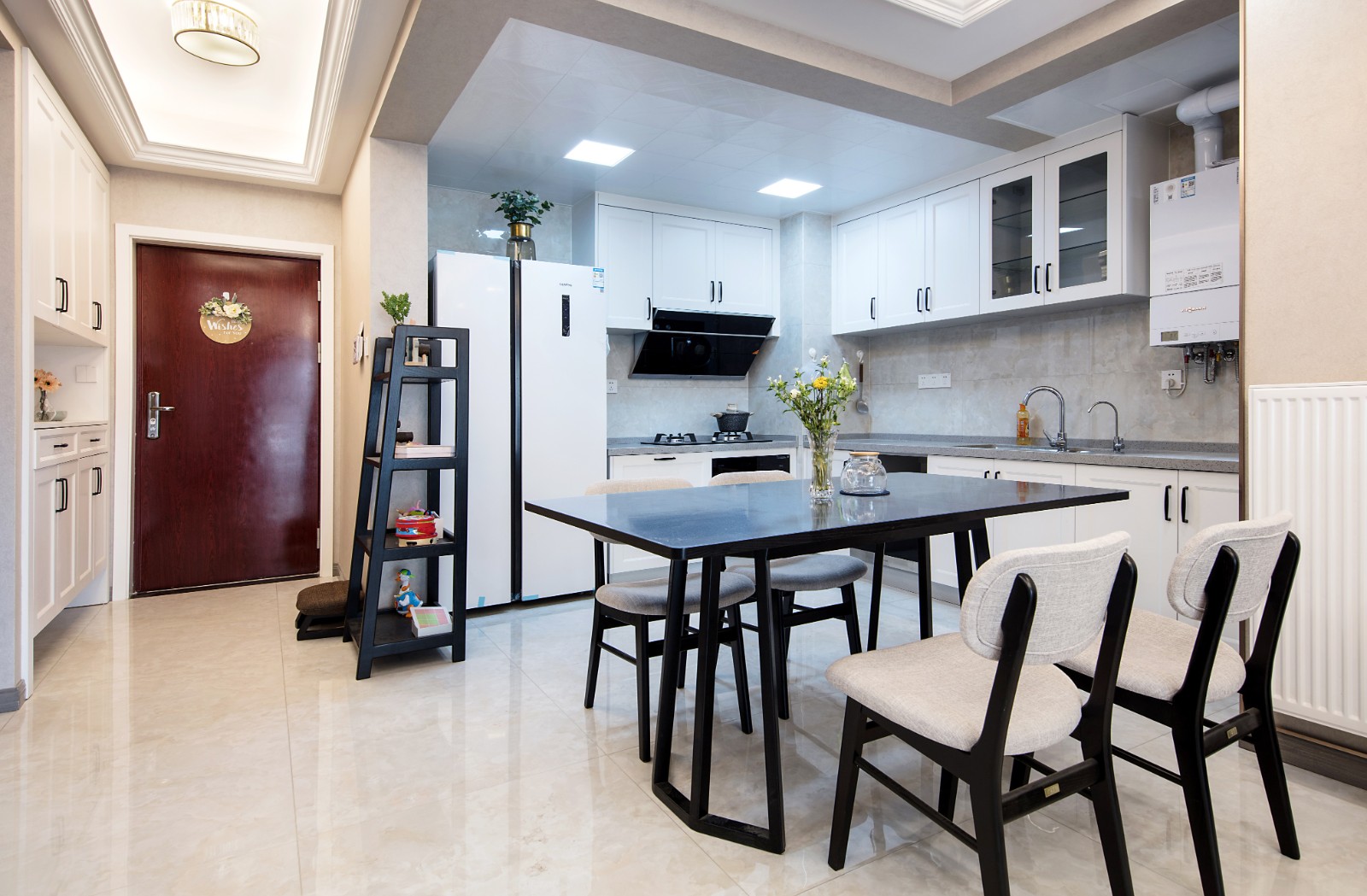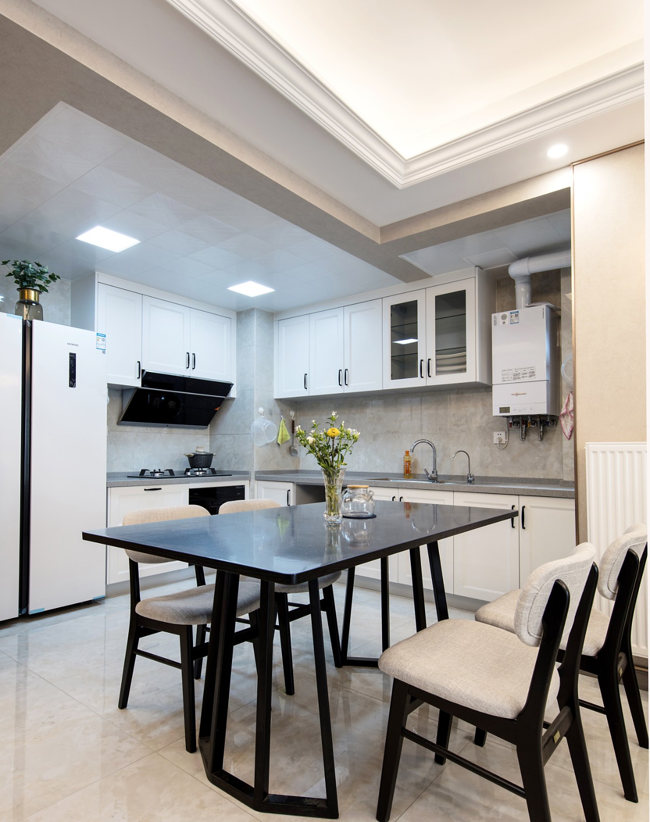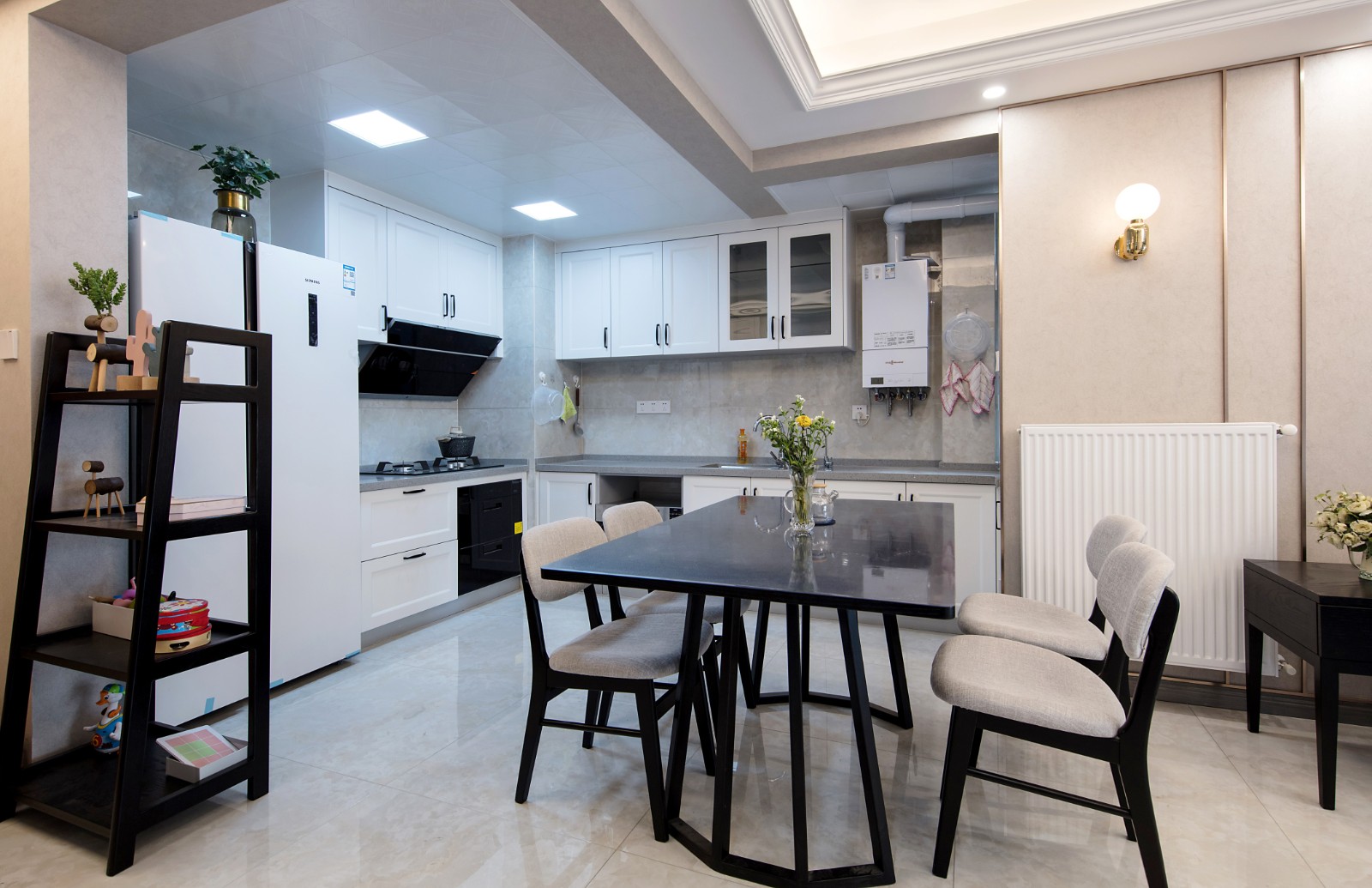 餐廳區域與開放式的廚房設計在一塊區域,有效節約了室內空間。而黑白配色的桌椅簡約耐看搭配以花束,溫馨而又不失情趣感。