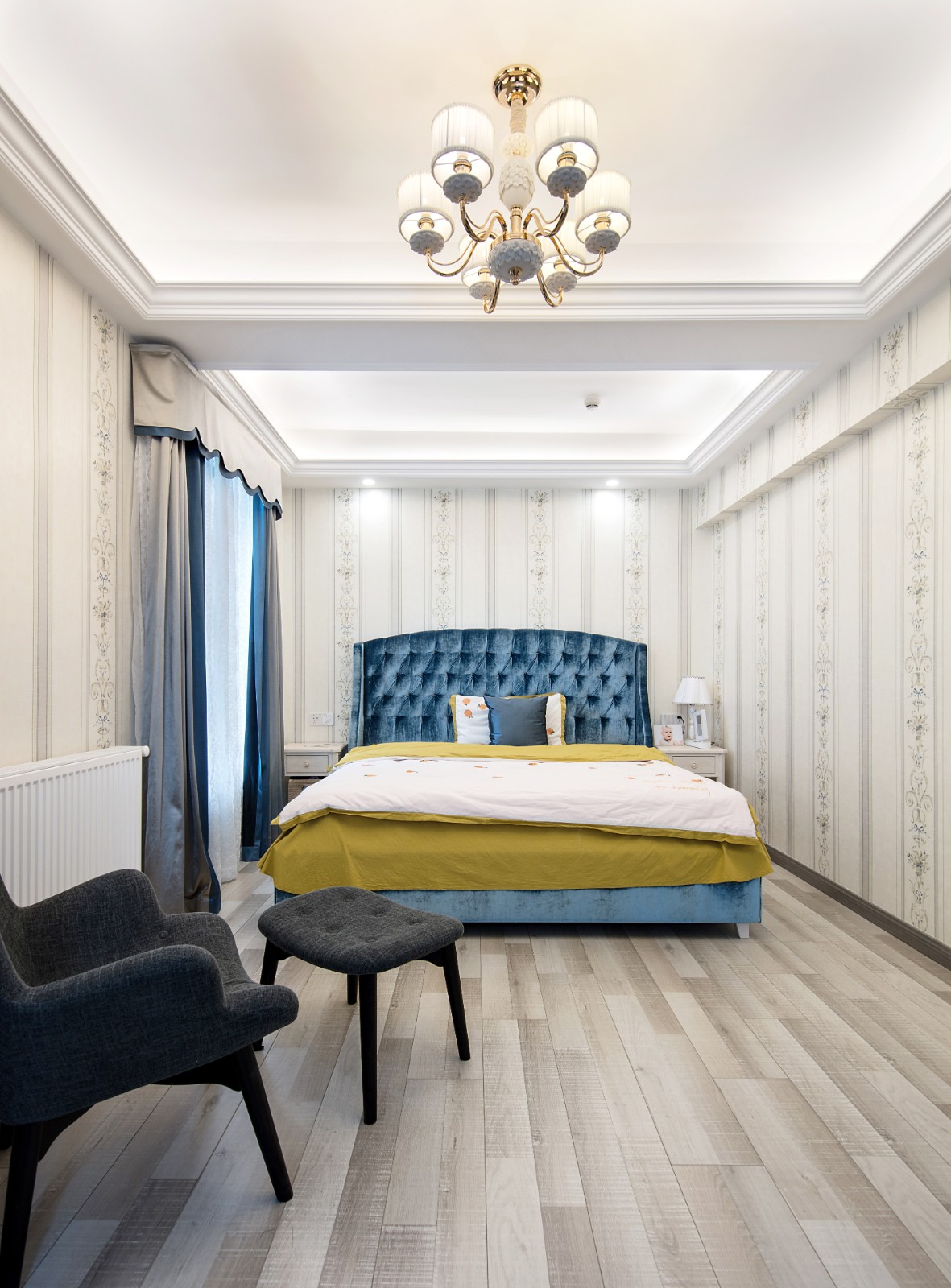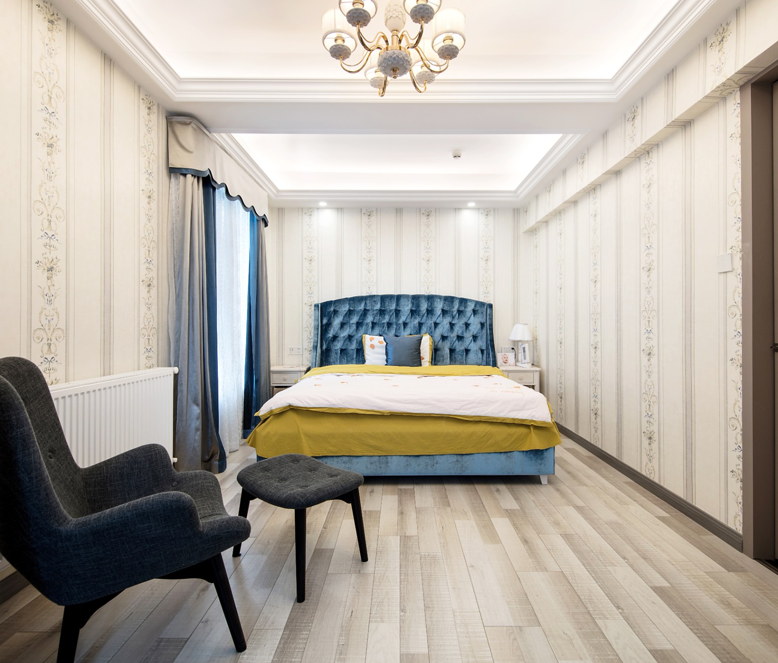 帶有木質質感的地板貼紙、墻貼強調了空間的自然氣息,藍色床具與灰色曲線沙發則讓空間多一抹柔和明亮氣息。