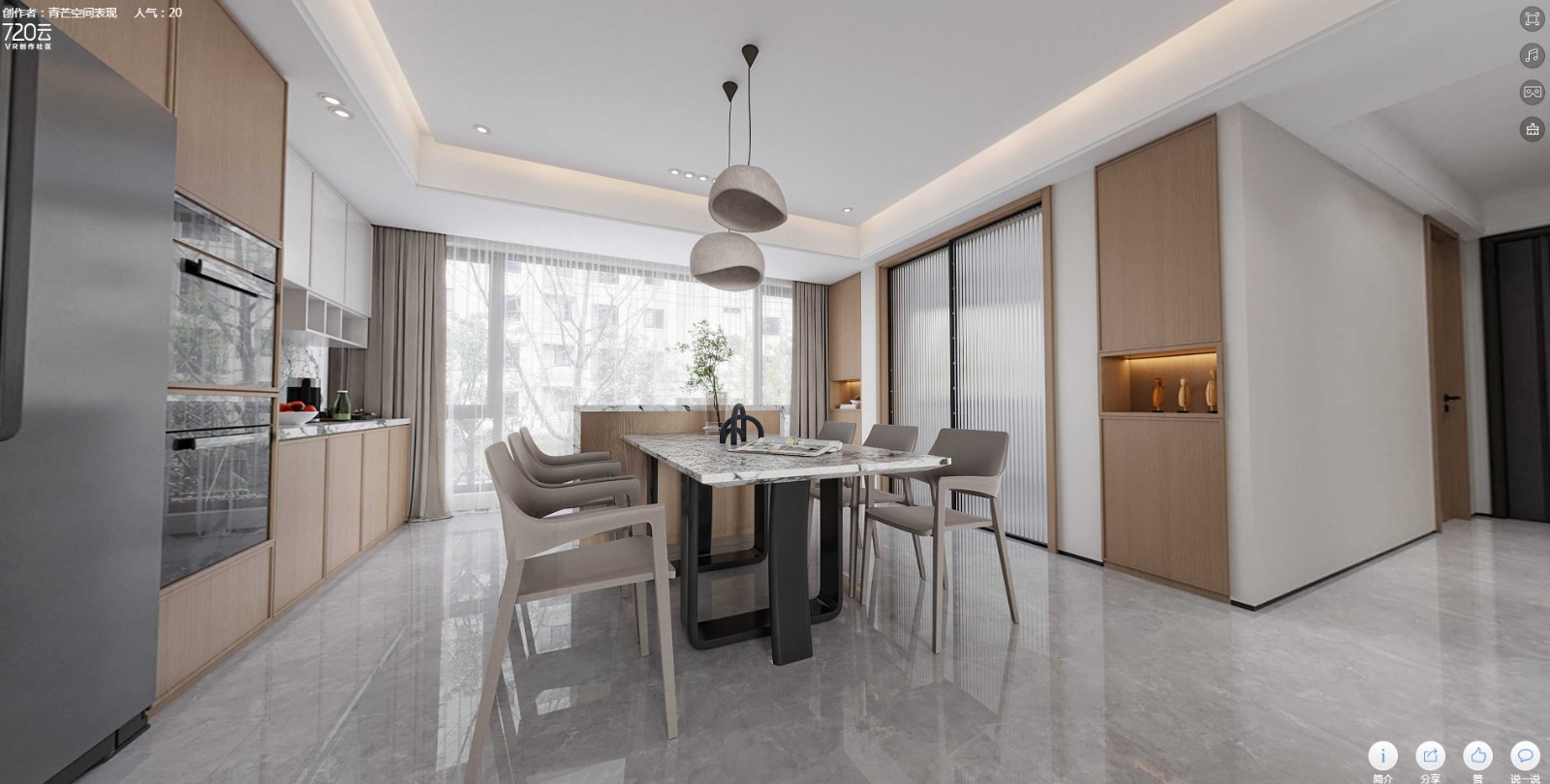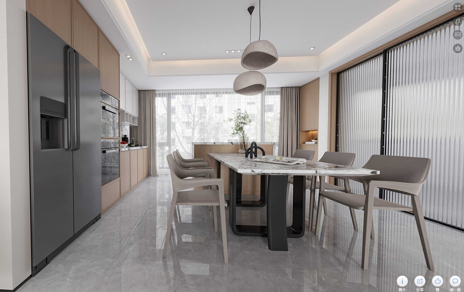 嵌入式雙開大冰箱存在感不強且能夠滿足日常使用需求,長條形淺色餐桌耐看且能夠滿足多位家庭成員的就餐需求。