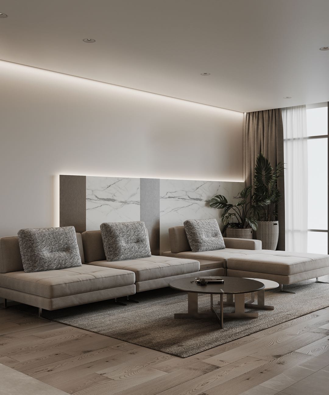 客廳區域整體用色相對比較柔和素雅,大面積的白色的配色清新的原木色,營造一種典雅清新的柔和美。