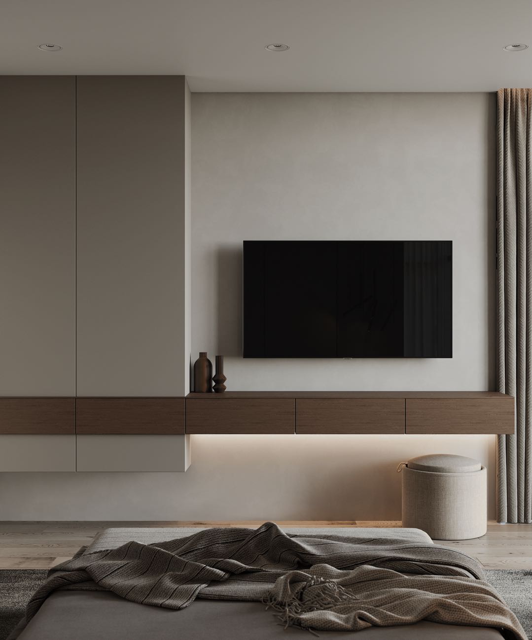 該區域沿用了與客廳一致的配色,強調整個家居環境的銜接感。墻面借助置物臺的變化放置裝飾空蕩的墻面,為空間增添藝術時尚氛圍。