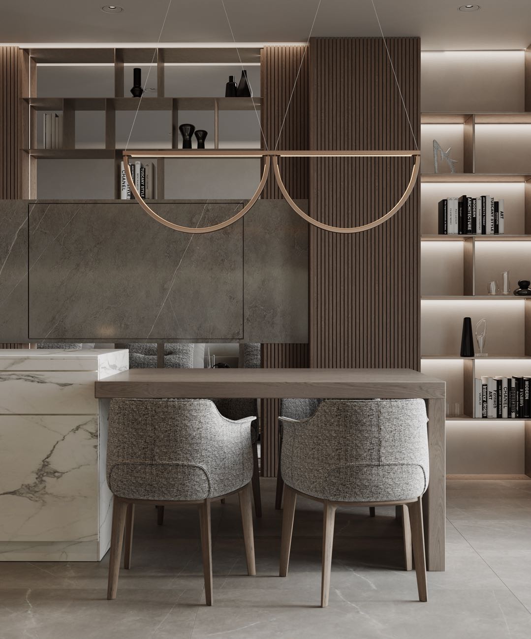 大面積的木質材料搭配上帶有天然紋理的大理石臺面,整體給人以古樸清新的自然韻味感。