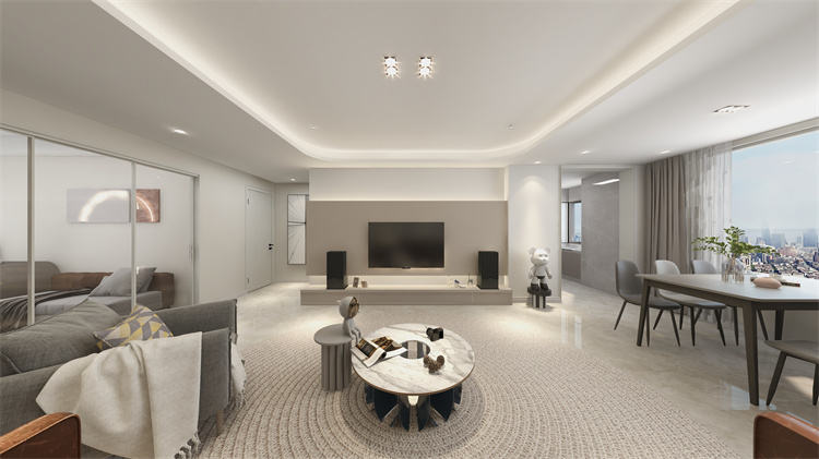 大面積的白色搭配上灰色沙發(fā),整體給人簡約的樸素感。而由弧線組成的木色地毯則為空間增添了一抹不一樣的獨特氣息。