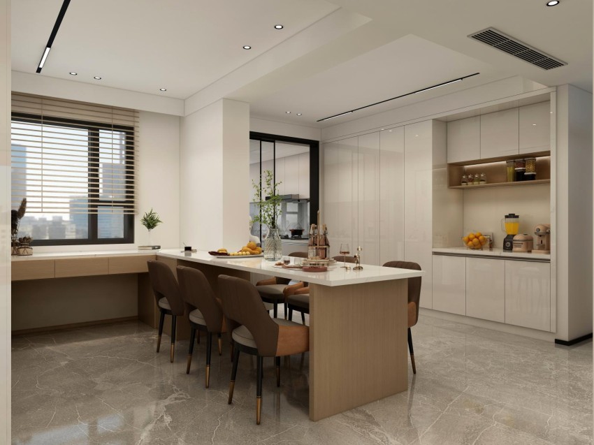 合理的利用了兩個窗戶中間的位置,吧臺風格的桌子和整體裝修風格達到了匹配。餐桌兩邊都具有窗戶,用餐同時可以保持空氣流通。