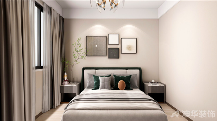 臥室仍舊保持了奶茶色的色調,每一處空間合理利用的同時,墻上掛畫都是獨特的現代簡約風格。