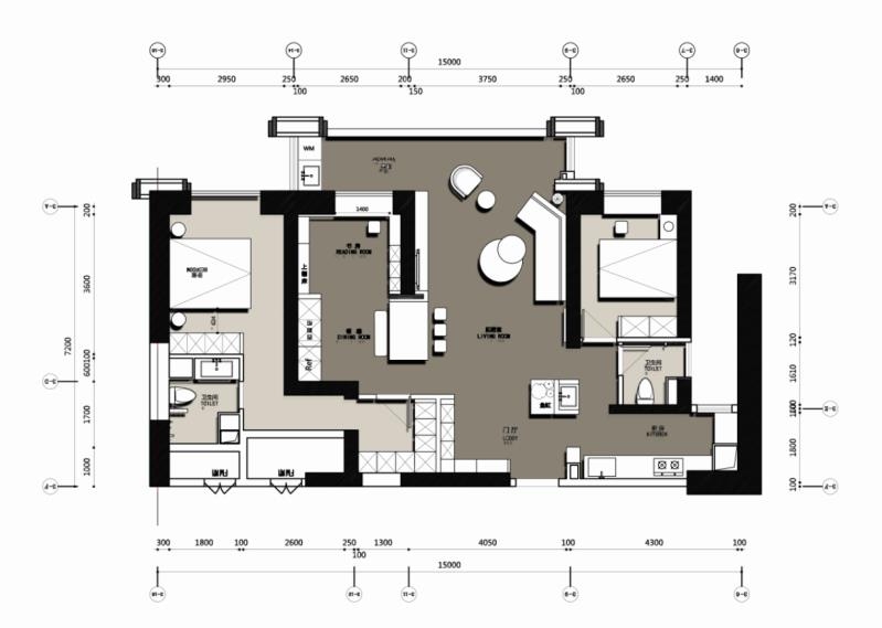 灰色線條的設計和灰色的沙發相映成章,客廳內的書柜彰顯了家庭的文化氛圍。