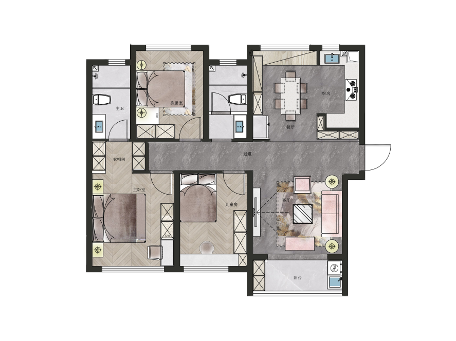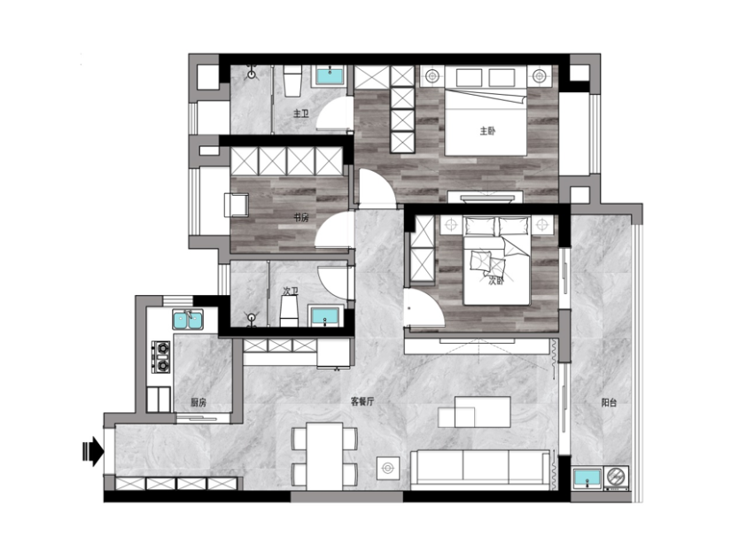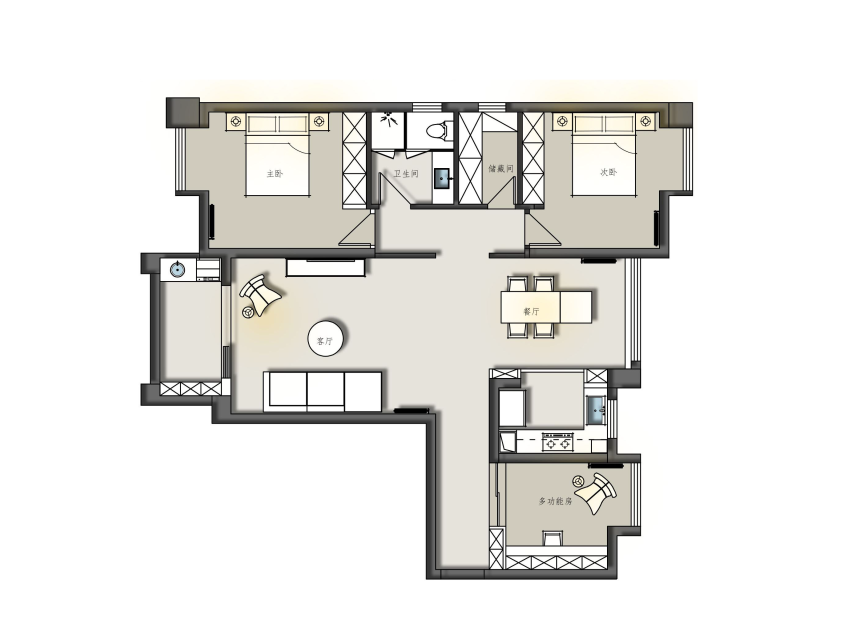 1 將主衛納入主臥,并設置L型衣柜,補充收納,形成一個功能齊全、舒適便捷的私人空間。