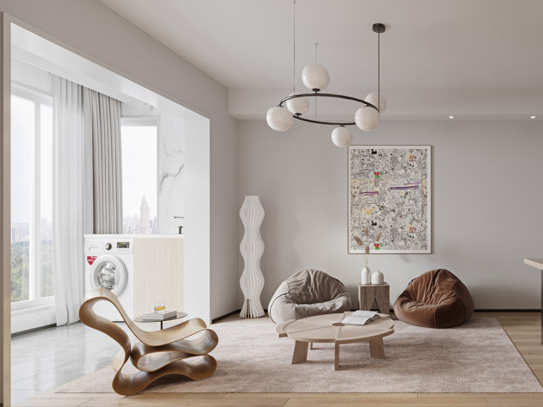 大面積的白色搭配上灰色沙發,整體給人簡約的樸素感。而由弧線組成的木色地毯則為空間增添了一抹不一樣的獨特氣息。