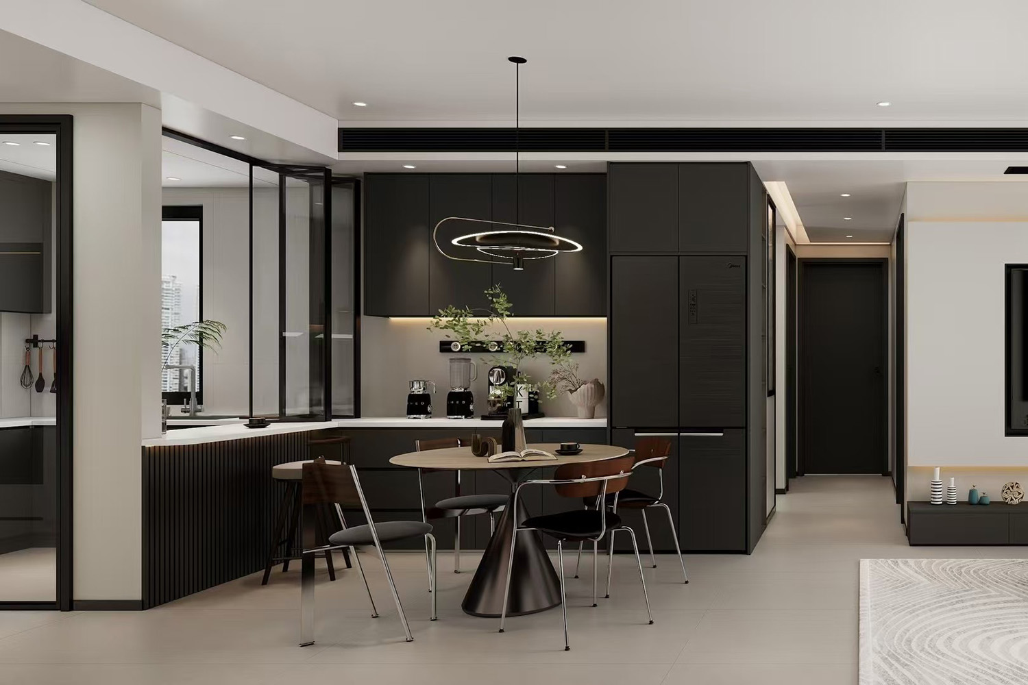 3 廚房雙向聯(lián)動門,可開放可封閉,防油煙也可拓展空間視覺。